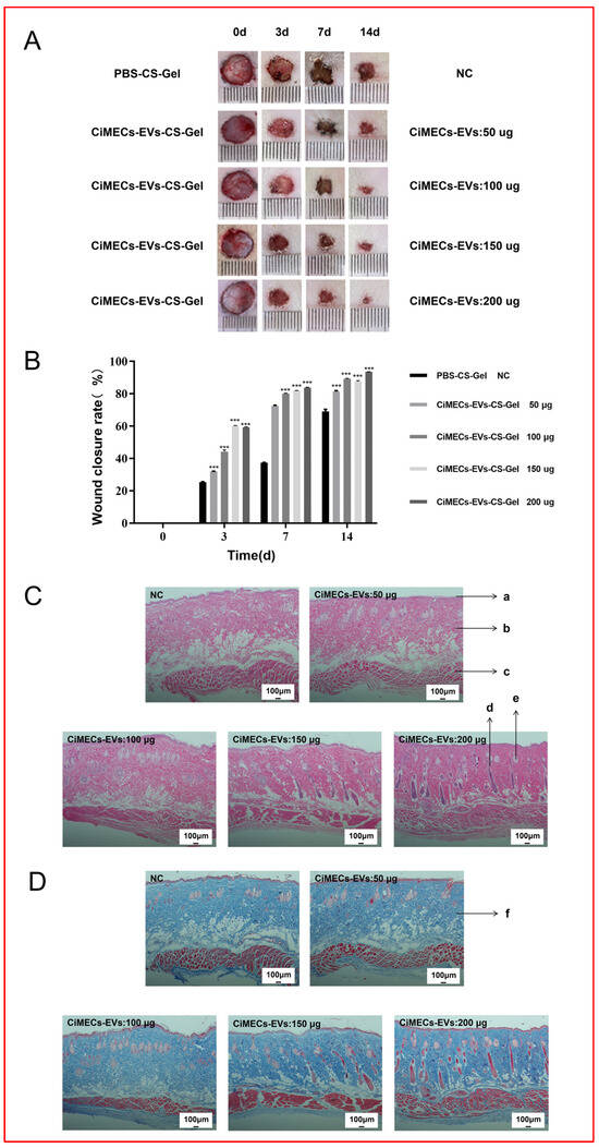 CMECG promoted the repair of skin wounds, the regeneration of skin tissues, and the formation of collagen in rats. (A). Wound closure status of rat wound skin repaired by CMECG with different concentrations of CiMECs-EVs. (B). Wound healing rate. (C). Histological analysis of wound callus tissue: HE staining. a: Epidermis b: dermis c: Dermatomuscular tissue d: Hair follicle e: Sebaceous gland; Scale bar, 100 μm. (D). Histological analysis of wound callus tissue: Masson staining. f: Collagen fibers (blue-stained portion). Scale bar, 100 μm. Note: All experiments were performed with n = 3 independent experiments, each with 3 technical replicates. Statistical analysis was performed using One-way ANOVA followed by Tukey’s post hoc test. *** p < 0.001.