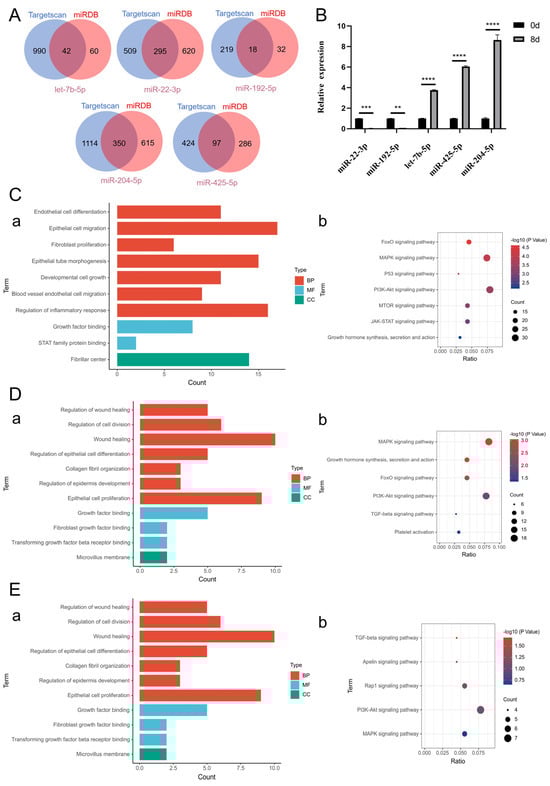 MiRNA sequencing and bioinformatics analysis revealed that the miRNAs present in CiMECs-EVs were closely related to skin wound repair. (A). Venn diagram of the predicted miRNA targets. (B). Validation results of differential miRNA quantitative PCR. Note: **** p < 0.0001, *** p < 0.001, ** p < 0.01. (C–E). GO functional analysis and KEGG pathway enrichment analysis of the target genes of let−7b−5p, miR−22−3p and miR−192−5p. (a). GO functional analysis of miRNA target genes; (b). KEGG pathway enrichment analysis of miRNA target genes.