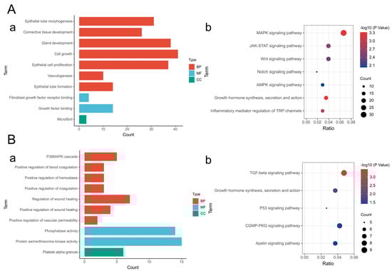 (A,B). GO functional analysis and KEGG pathway enrichment analysis of the target genes of miR−204−5p, and miR−425−5p. (a). GO functional analysis of miRNA target genes; (b). KEGG pathway enrichment analysis of miRNA target genes.