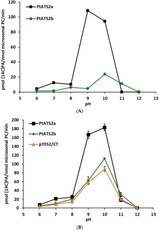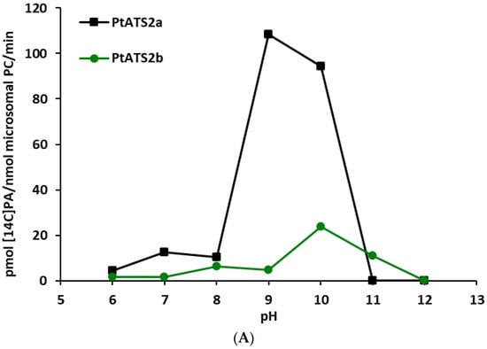 Another external factor tested was the pH of the incubation buffers. Assays were performed with four different buffers: 0.04 M phosphate buffer (pH 6.0–7.0), 0.04 M Tris-HCl (pH 8.0–10.0), 0.04 M NaHCO3-NaOH (pH 11.0), and 0.04 M Na2HPO4-NaOH (pH 12.0). PtATS2a had very low activity at pH 6.0. This activity increased with the increase in pH to 7.0 (first peak of activity) and dropped somewhat down at the pH of 8.0. Further increase in pH to 9.0 caused a rapid increase in the PtATS2a activity (about ten times; a second peak of activity). At pH 10.0, a decrease in activity of about 13% in comparison to the maximum one (from pH 9.0) was recorded. Then, PtATS2a started to lose its activity rapidly, and at pH 11.0 and 12.0, its activity was close to zero. The second enzyme studied, PtATS2b, also had very low activity at pH 6.0. The activity of this enzyme remained at a very low level also at pH 7.0. At pH 8.0, the activity of PtATS2b was increased (about 5.5 times higher than the activity at pH 6.0; first peak of activity) and, at pH 9.0, somewhat dropped down. The second peak of activity of PtATS2b was recorded at pH 10. At pH 11.0, PtATS2b lost about half of activity recorded at pH 10 and at pH 12.0, it did not show LPAAT activity. The response pattern of the PtATS2b activity to pH values of incubation media was somewhat similar to that of PtATS2a, with a shift in first peak of activity from pH 7 to pH 8 and the second peak of activity from pH 9 to pH 10. Furthermore, its activity was generally lower than that of PtATS2a. Results are presented in Figure 2A,B (activity assigned only to the tested enzymes and overall activity obtained in the assays with tested microsomal fractions, respectively).