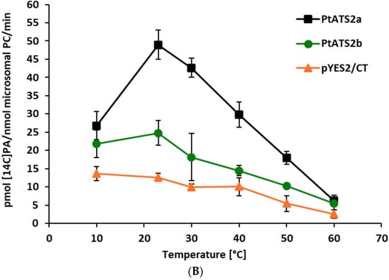 The effect of the temperature on PtATS2a and PtATS2b activity was examined in the range from 10 to 60 °C. Of these two enzymes, PtATS2a showed a stronger response to the changes in temperature. Its activity increased by approximately 2.8 times when the temperature changed from 10 °C to 23 °C and reached its maximum value at this temperature. Further increases in temperature to 30 °C, 40 °C, 50 °C, and 60 °C caused a gradual decrease in the PtATS2a activity by approximately 14, 49, 68, and 86%, respectively, with the highest activity recording at 23 °C. The activity of PtATS2b changed in the temperature range from 10 °C to 60 °C in a somewhat similar way to the activity of PtATS2a. The main difference was a less drastic increase in the activity of PtATS2b in the temperature range of 10 °C to 23 °C (about 50% increases in activity). The results are presented in Figure 1A,B. In the first figure, the activity assigned only to the tested enzymes is presented, and in the second figure, the overall activity obtained in the assays with microsomal fractions of the yeast carrying the tested enzymes (i.e., the sum of background LPAAT activity and the activity of tested enzyme) as well as the background LPAAT activity only is shown.