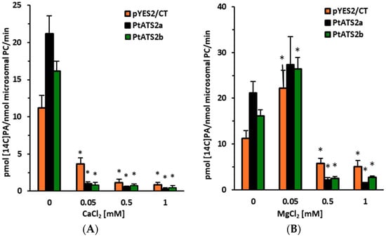 Effect of Ca2+ (A) and Mg2+ (B) ions on the LPAAT activity in control yeast microsomal fractions (yeast Δale1 mutant transformed with an empty plasmid pYES2) and in microsomal fractions of yeast Δale1 mutant overexpressing Phatr3_J11916 (encoding PtATS2a) and Phatr3_J43099 (encoding PtATS2b) genes of P. tricornutum. Mean values and standard deviations (SDs) are presented (data from at least three independent assays). Asterisks indicate statistical significance of the LPAAT activities between the control (ions not added) and the tested ions’ concentrations in assayed microsomal fractions, as determined by Student’s t test (p ≤ 0.05).