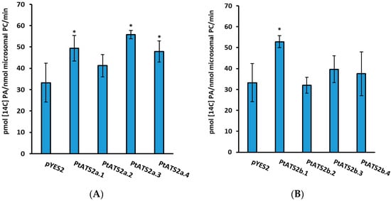 The PtATS2a (panel (A)) and PtATS2b (panel (B)) activity in control yeast microsomal fractions (yeast Δale1 mutant transformed with an empty plasmid pYES2/CT) and in microsomal fractions of yeast overexpressing Phatr3_J11916 (PtATS2a) or yeast overexpressing Phatr3_J43099 PtATS2b). In the case of control yeast, the average value from four transformation events and in the case of Phatr3_J11916 or Phatr3_J43099 overexpressors, the data for each transformation event are presented. [14C]18:1-CoA together with sn-1–18:1-LPA were used as acyl donor and acceptor, respectively. Mean values and SD are presented. Asterisk denotes significant differences between control and Phatr3_J11916 or Phatr3_J43099 overexpressors, in “mean difference two-sided test” at α = 0.05.