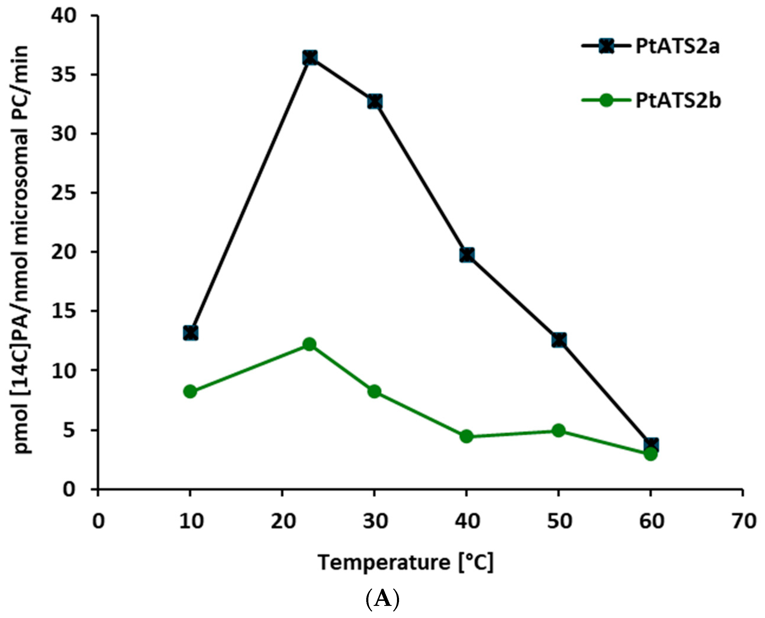 Both PtATS2a and PtATS2b showed the highest activity at 23 °C. However, PtATS2a was more temperature-dependent than PtATS2b. Its activity varied more than the activity of PtATS2b, especially during the raise of the temperature from 10 to 23 °C (for PtATS2a, it was 2.8-fold increase in activity, and for PtATS2b, it was about a 0.5-fold increase in activity).