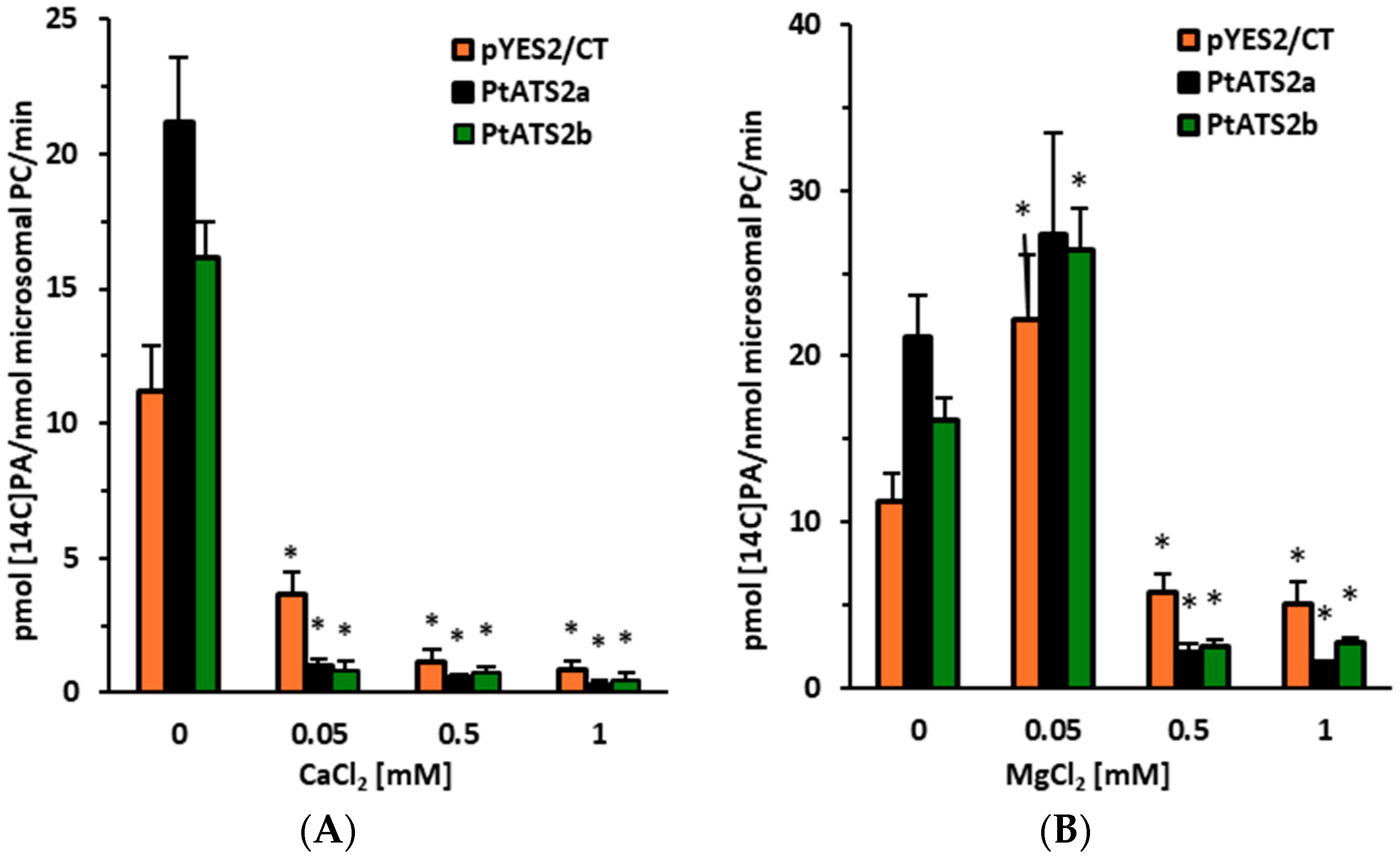 PtATS2b activity, the effect of magnesium and calcium ions was also studied. The calcium ions at concentrations of 0.05–1 mM drastically decreased the activity of both enzymes. However, the effect of magnesium ions was somewhat different. The lowest concentration of magnesium ions used (0.05 mM) had only a minor effect on the activity of both enzymes, while higher concentrations (0.5 mM and 1 mM) significantly inhibited their activity. An inhibitory effect of calcium ions was also noted for LPAAT enzymes from palm (