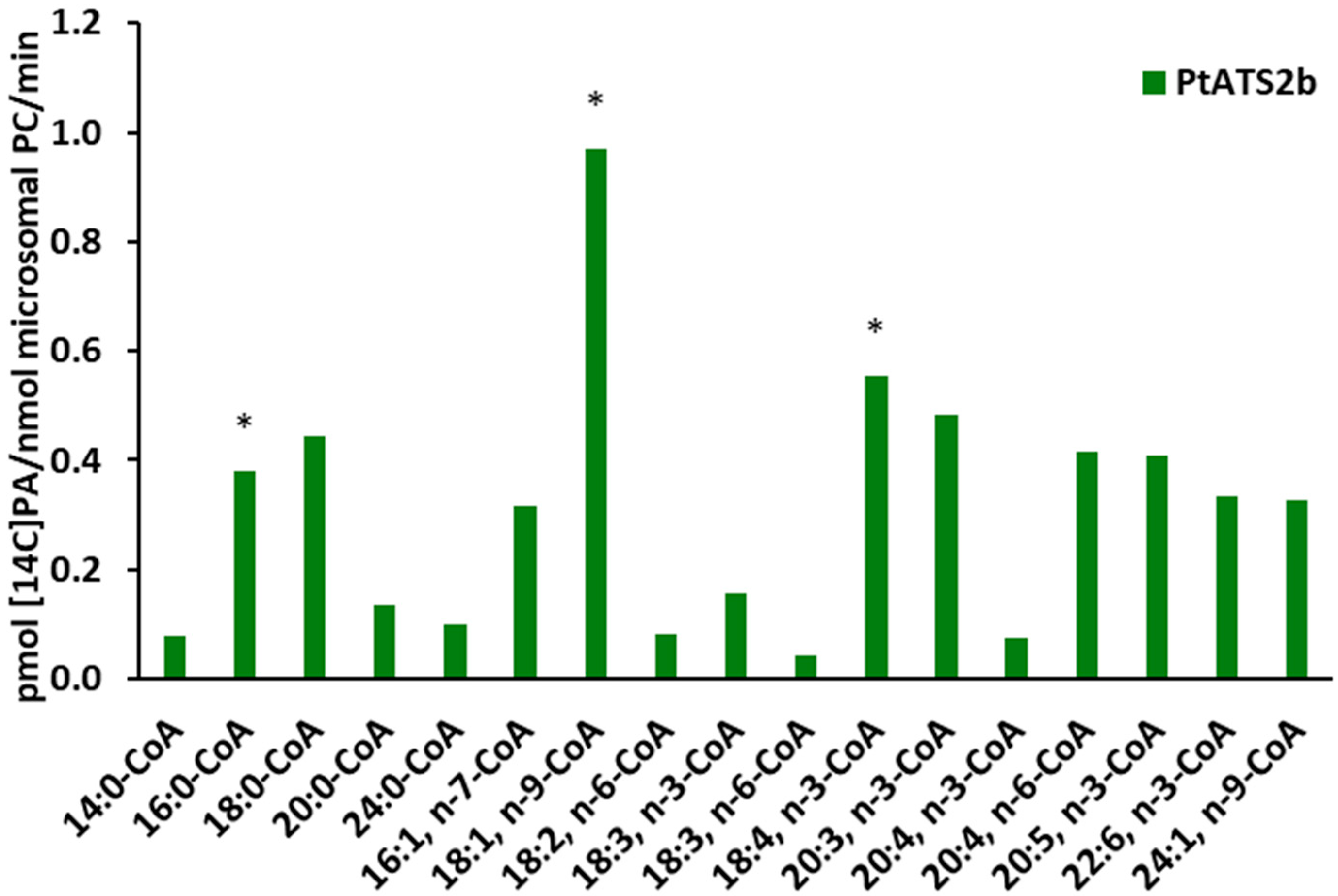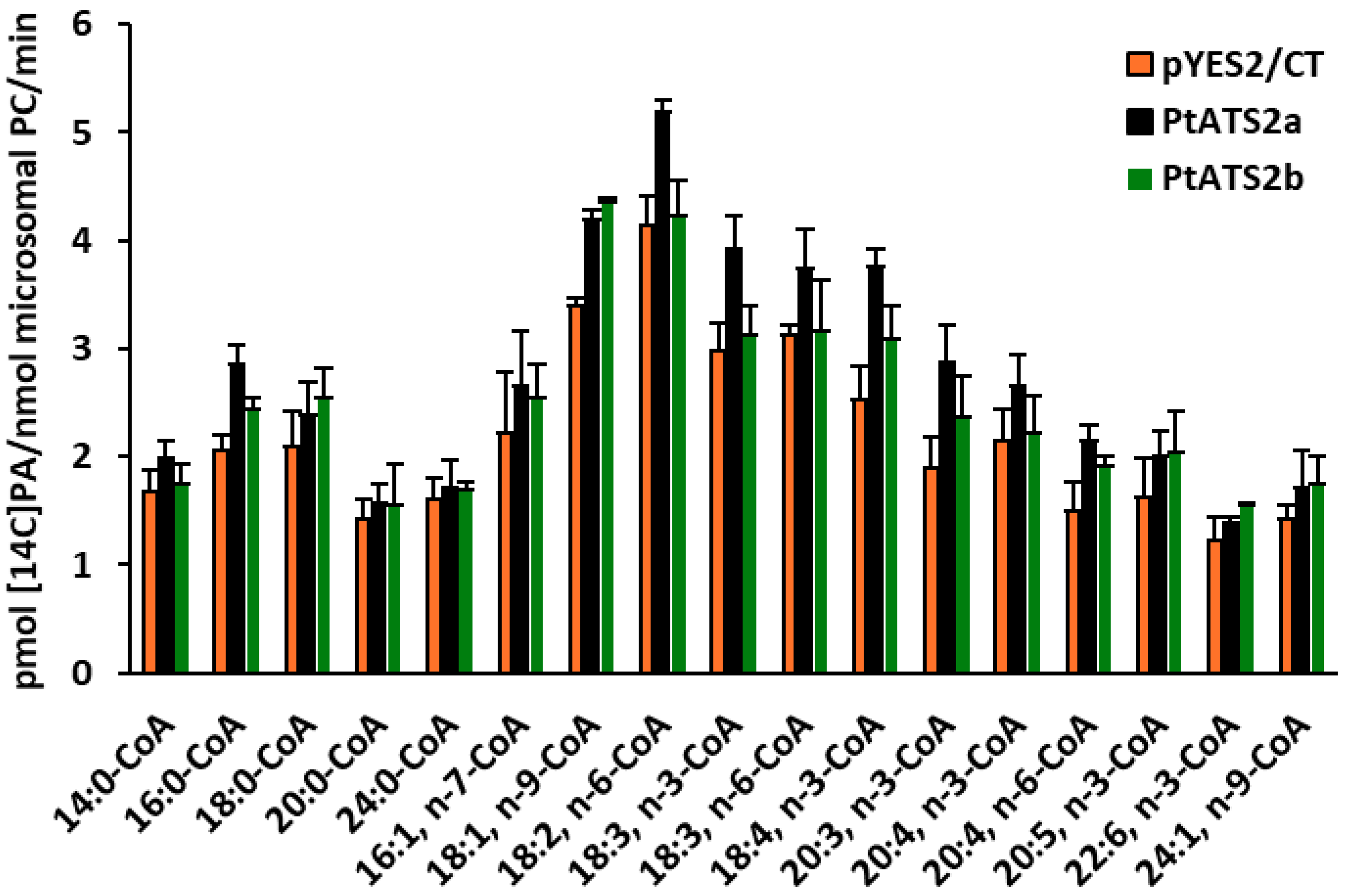 PtATS2a exhibited significantly higher activity towards 18:2-CoA n-6, 18:3-CoA n-3, and 18:3-CoA n-6 than