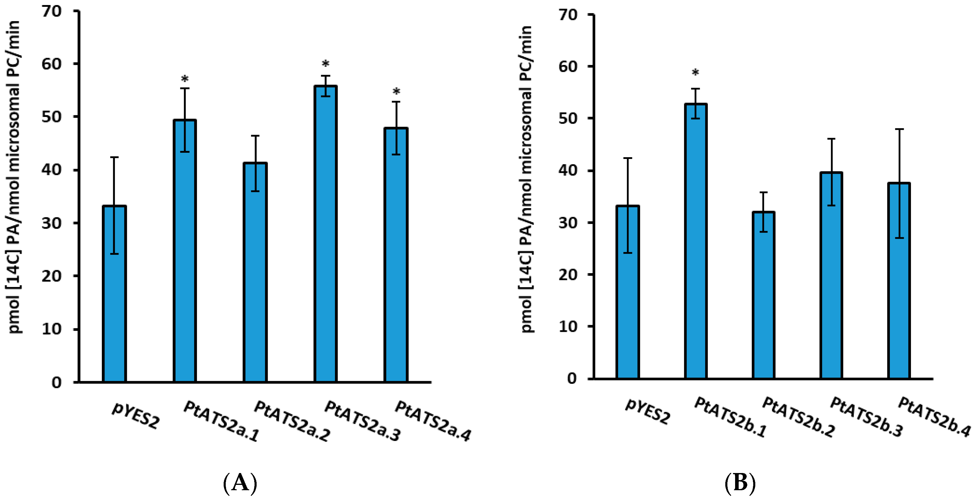 The activity of the tested enzymes (PtATS2a and PtATS2b) is presented as the differences in LPAAT activity in assays with microsomal fractions of yeast overexpressing tested enzyme and microsomal fractions of yeast transformed with an empty plasmid. By such calculation, we assumed that endogenous LPAAT activity caused by the yeast SLC1 enzyme (of LPAAT type) is the same in both type of microsomes/assays. However, some of our results (for instance, presented experiments evaluating the effects of divalent cations on the activity of tested enzymes) indicated that overexpression of the studied genes can reduce somewhat-endogenous LPAAT activity. Unfortunately, there is no way to precisely measure the LPAAT activity caused by SLC1 and the part of LPAAT activity caused by introduced PtATS2a or PtATS2b. Thus, the LPAAT activity of tested enzymes presented in this way has to be treated as approximate activity, probably slightly lower than the real one. However, we think that this is the best way of presentation/measurement of the activity of studied enzymes. In the presented results, we are also showing the original data obtained in performed assays.