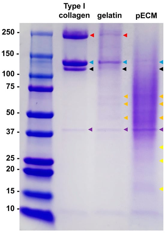 Sodium dodecyl sulfate-polyacrylamide gel electrophoresis analysis of Type I collagen, gelatin, and porcine extracellular matrix (pECM) (Coomassie blue staining). The arrows indicate major bands as follows: red, collagen β-chain; blue, α1-chain; black, α2-chain; purple, ~40 kDa band; orange, proteins in the 37–100 kDa range; and yellow, proteins < 37 kDa.