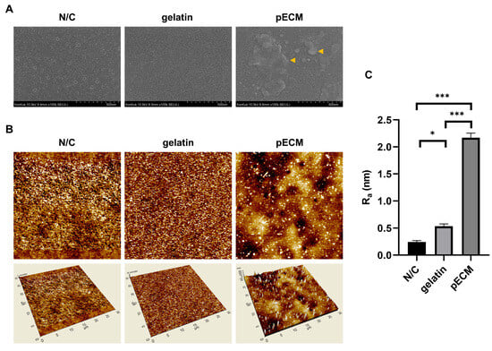 Quantitative analysis of average surface roughness (Ra) revealed that pECM-coated plates had significantly higher Ra values (2.169 ± 0.086 nm) than those of gelatin (0.534 ± 0.045 nm) and N/C (0.242 ± 0.027 nm) conditions (Figure 2C).
