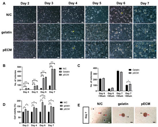 Colony counting results showed a steady increase in the number of colonies from days 4 to 7 under the three different conditions (Figure 3B). Although gelatin exhibited a slightly higher total number of colonies on day 7, pECM supported a greater proportion of larger colonies (>80 µm) (Figure 3C). Across all time points, colony numbers were consistently lowest under the N/C condition. Cell viability also showed a consistent pattern across the culture period: gelatin showed the highest viability, followed by pECM, with N/C displaying the lowest values at all time points (Figure 3D).