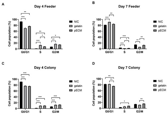 On day 4, pFeeders under N/C conditions showed a significantly higher proportion of G0/G1 phase than those in the other groups, whereas both gelatin and pECM coatings increased the proportion of S and G2/M phases (Figure 4A). Notably, the S phase was significantly higher under pECM than under gelatin conditions. On day 7, pFeeders under gelatin conditions showed the highest G0/G1 phase, while the S phase was most elevated in the N/C group and significantly higher in pECM than in gelatin. In the G2/M phase, both the N/C and pECM groups showed higher proportions than the gelatin group (Figure 4B).