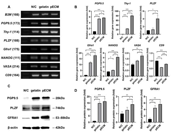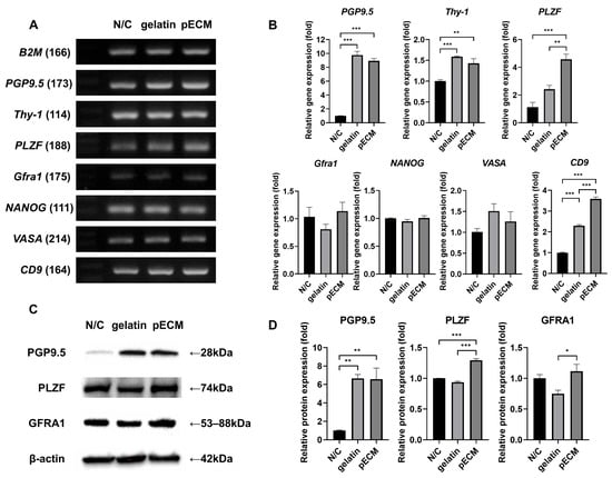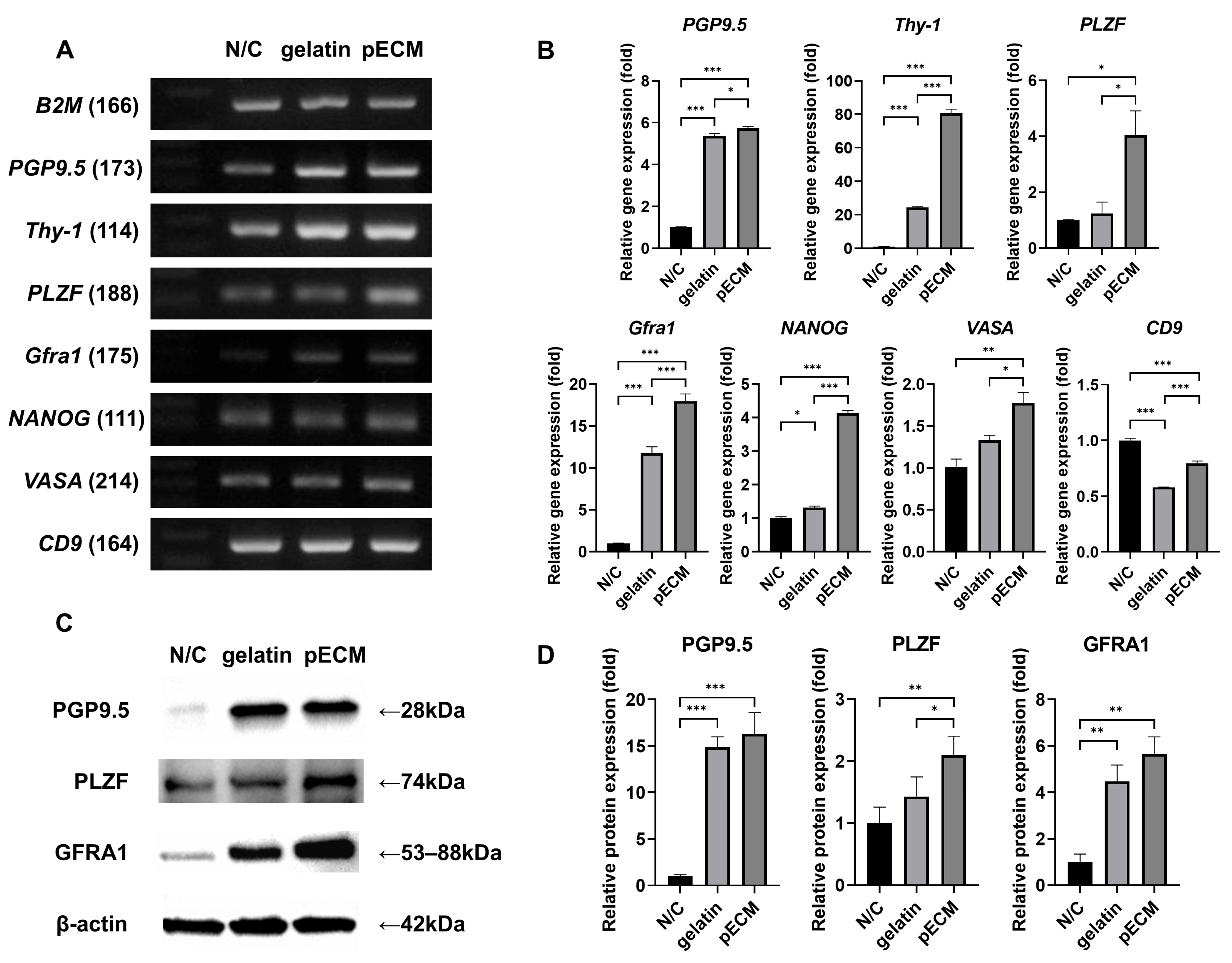 Quantitative PCR (qPCR) analysis confirmed that PGP9.5 and Thy-1 were significantly upregulated in gelatin and pECM compared with N/C, whereas PLZF expression was highest in pECM (Figure 5B). Gfra1, NANOG, and VASA showed no significant differences among the groups. CD9 expression was highest in pECM, intermediate in gelatin, and lowest in N/C.