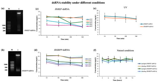 Stability analysis of dsRNA targeting HbREF and HbSRPP genes under various environmental conditions. The migration of (a) HbREF-specific dsRNA and (b) HbSRPP-specific dsRNA in agarose gel electrophoresis was compared against a DNA marker to estimate fragment size. Temperature stability profiles showing dsRNA concentration for (c) HbREF and (d) HbSRPP following incubation at 25–60 °C in a water bath at different time intervals. (e) UV stability of HbREF and HbSRPP dsRNA under continuous UV irradiation at various exposure times. (f) Environmental stability of dsRNA under natural sunlight and shade conditions. dsRNA concentrations were quantified using a SPECTROstar Nano microplate reader with LVis Plate technology. Data represent mean ± standard error from three independent experiments. Statistical significance was determined by one-way ANOVA (* p < 0.05).