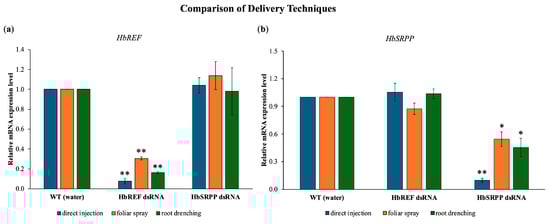 Comparative analysis of dsRNA delivery systems for RNAi-mediated gene silencing in H. brasiliensis. Quantitative RT-PCR analysis showing relative mRNA expression levels of (a) HbREF and (b) HbSRPP genes post-treatment with gene-specific dsRNA delivered through direct stem injection, foliar spray application, or root drenching methods. Expression levels were normalized to housekeeping genes and calculated using the 2−ΔΔCt method relative to mock-treated controls. Data represent mean ± standard error from three independent biological replicates. Statistical analysis performed using one-way ANOVA with Tukey’s multiple comparison test (* p < 0.05, ** p < 0.01).