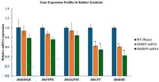 Impact of HbREF and HbSRPP gene silencing on rubber biosynthesis pathway gene expression. Quantitative RT-PCR analysis of rubber synthesis-related genes following RNAi-mediated silencing of HbREF and HbSRPP in H. brasiliensis. Relative mRNA expression levels of upstream genes (HbHMGR, HbFPPS, HbGGPPS) and downstream genes (HbCPT, HbRME) were assessed post-dsRNA treatment. Gene expression was normalized to housekeeping genes and presented relative to controls. Data represent mean ± standard error from three independent biological replicates. Statistical significance determined by one-way ANOVA (* p < 0.05).