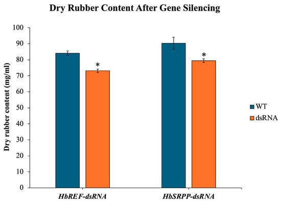 Impact of HbREF and HbSRPP gene silencing on DRC in RRIM600 saplings. Quantitative analysis of DRC following RNAi-mediated silencing of HbREF and HbSRPP genes in H. brasiliensis cv. RRIM600. Latex samples were collected and processed for DRC determination. Data represent mean ± standard error from six independent saplings per treatment group. Statistical significance was determined by one-way ANOVA with Tukey’s post hoc test (* p < 0.05).