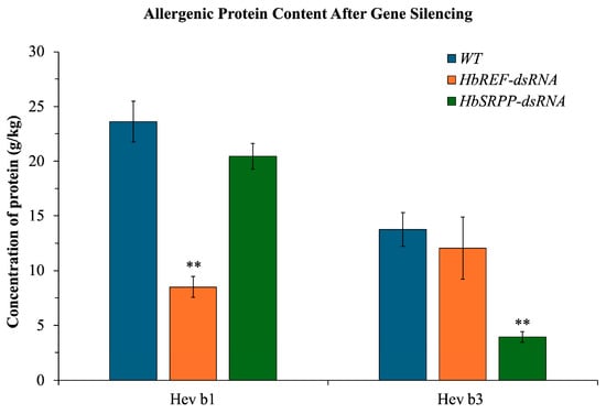 Reduction in major latex allergens following targeted gene silencing in H. brasiliensis. Quantitative analysis of allergenic proteins Hev b1 and Hev b3 in latex samples following RNAi-mediated silencing of HbREF and HbSRPP genes. Protein concentrations were determined by enzyme-linked immunosorbent assay (ELISA) using allergen-specific antibodies. Data represent mean ± standard error from six biological replicates. Statistical significance determined by two-way ANOVA with Tukey’s multiple comparison test (** p < 0.01).