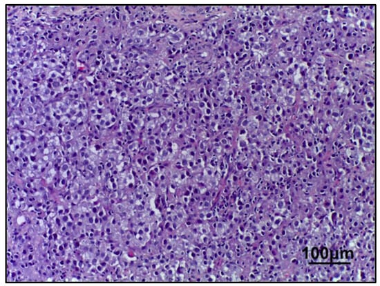 In breast tissue samples/pre-NAC biopsies from all patients (n = 161), a morphological picture of invasive, non-specific type carcinoma (G3 according to the Nottingham grading system in the Bloom–Richardson modification), was found. This included microfragments of the mammary gland with pathologically altered tissue (tissue and cellular atypia of the parenchyma) with accumulation of pleomorphic atypical cells (>300) forming solid structures. The cytoplasm of these cells was in the form of a thin rim; their nuclei, with signs of polymorphism, are located eccentrically and are round in shape with an “eaten” karyolemma. They have a stromal component with a weak desmoplastic reaction (Figure 1).