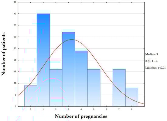 Subsequently, based on the immunophenotyping performed, all patients were diagnosed with the triple-negative surrogate molecular genetic subtype of breast cancer. The main focus of important theoretical and practical significance was analysis of the correlation between the degree of NIS expression in atypical mammary gland cells and the number of pregnancies in the patient’s history. In a retrospective analysis of the gravidity status of patients in the cohort (n = 161) according to medical records, the median number of pregnancies was three (IQR: 1–4) (Figure 2), while the number of patients without pregnancies in the history was nine (5.5%).