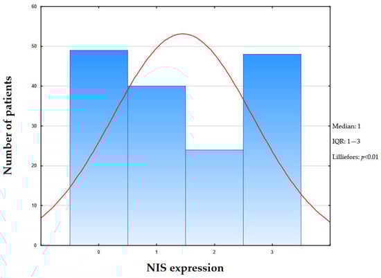 NIS-immunopositive reactions were found in 112 (69.5%) patients, while NIS 1+ was observed in 40 (35.7%) cases; NIS 2+ in 24 (21.4%) cases; and NIS 3+ in 48 (42.8%) cases. Triple-negative breast cancer was NIS-negative in 49 (30.4%) women, 9 of whom had no history of pregnancy. The median expression level was 1 (IQR: 1–3) (Figure 4).