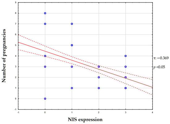 According to the results of statistical analysis of the correlation between NIS expression level and the woman’s gravidity status, the Kendall tau coefficient was −0.369 (p < 0.05), which corresponds to a weak–moderate negative correlation (Figure 5).