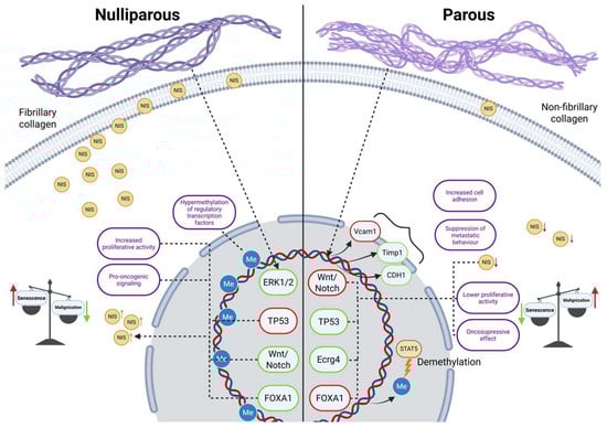 In addition, the extracellular matrix formed during pregnancy in the mammary gland stroma differs in the architecture of collagen fibers, the properties of which suppress pro-oncogenic signaling pathways and reduce both the risk of malignancy and the rate of proliferation, migration, and metastasis of cancer cells [].