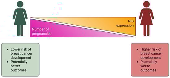 Based on the above data, it can be summarized that in NIS-overexpressing tumors, increased FOXA1 activity is also observed, which differs relative to earlier studies in this area [,]. However, the 2018 work by Séverine Guiu et al., demonstrated the existence of FOXA1-positive TNBC, associated with a more negative clinical prognosis []. The existence of separate subtypes within TNBC is not surprising, considering the fact that triple-negative breast cancer is an umbrella term that unites extremely heterogeneous subtypes of tumors, and therefore requires an individual approach to the selection of therapy within the framework of personalized medicine []. The implication of NIS and pregnancy in tumor biology, based on literature data, are summarized in Figure 6.