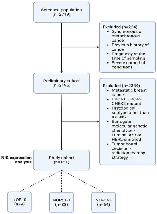Immunohistochemical staining on 161 TNBC pre-NAC biopsy was performed. The triple-negative subtype was diagnosed based on the College of American Pathology guidelines for Breast Biomarker Reporting March 2023, using the Allred score and standard HER2/neu assessment. The following primary antibodies were used: monoclonal antibodies against the sodium/iodide symporter (NIS/SL5A5; Affinity Biosciences Cat# DF2242, RRID: AB_2839473). For secondary antibody detection, a universal two-component HiDef Detection™ HRP Polymer system (Cell Marque, Rocklin, CA, USA) was used, including anti-IgG mouse/rabbit antibodies, horseradish peroxidase (HRP), and DAB substrate. Cell nuclei were counterstained with Mayer’s hematoxylin. We counted the percentage of positive tumor cells from 0 to 100%. The tissue staining intensity was graded using the modified Gainor’s semi-quantitative method from 0 to 3+, as follows: 0 points—staining absent; 1 point—pale cytoplasmic staining, distinguishing positive cells from the background, fine granules present; 2 points—distinct cytoplasmic staining with coarse granular staining pattern; 3 points—prominent membrane-cytoplasmic staining, coarse granular staining, individual granules are often not discernible [].