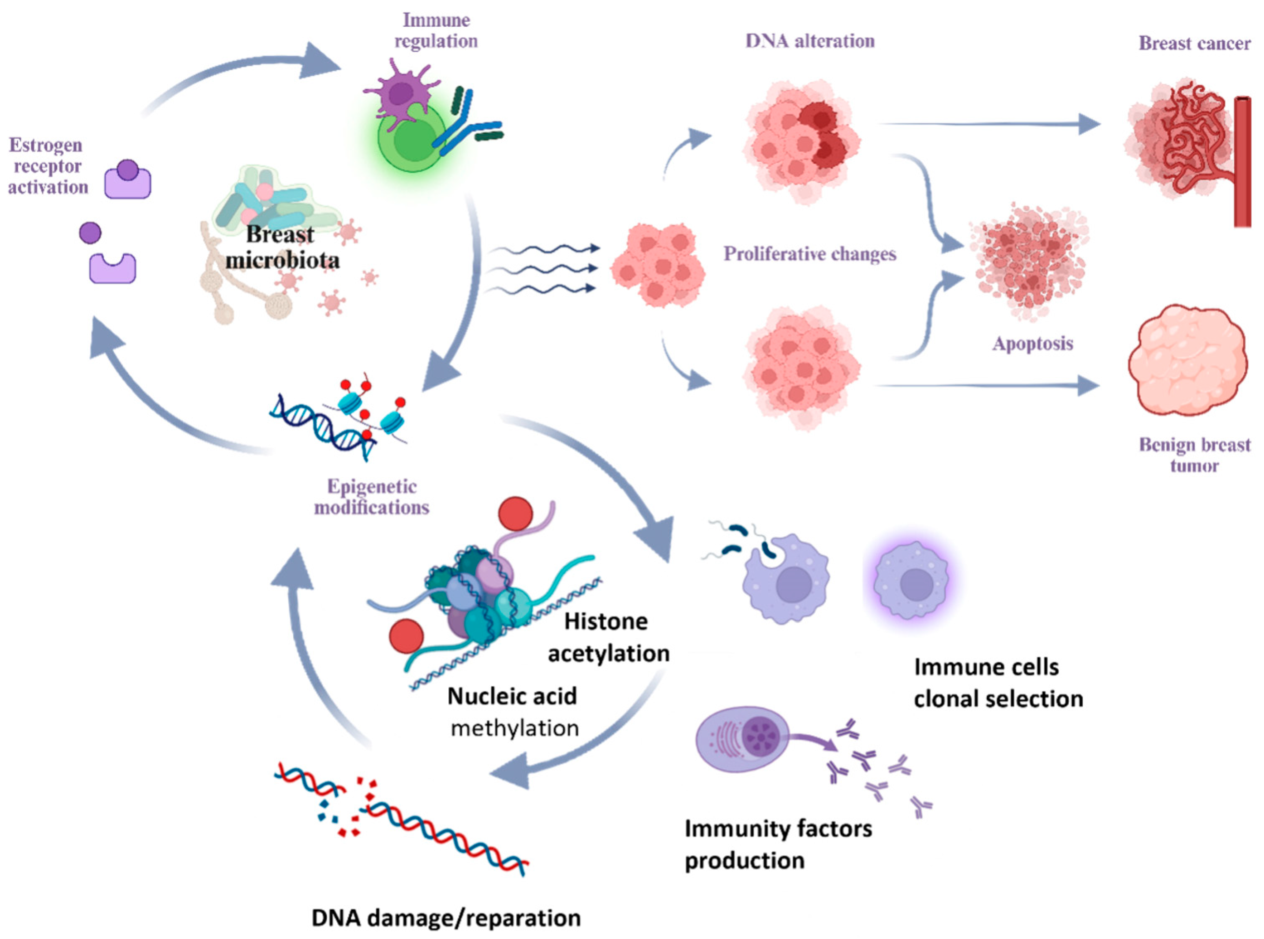 41], shapes a unique ecological niche that determines which microbial communities can survive and thrive. Finally, the lymphohematogenous pathway involves the systemic dissemination of microbes to the breast through the lymphatic system and bloodstream [