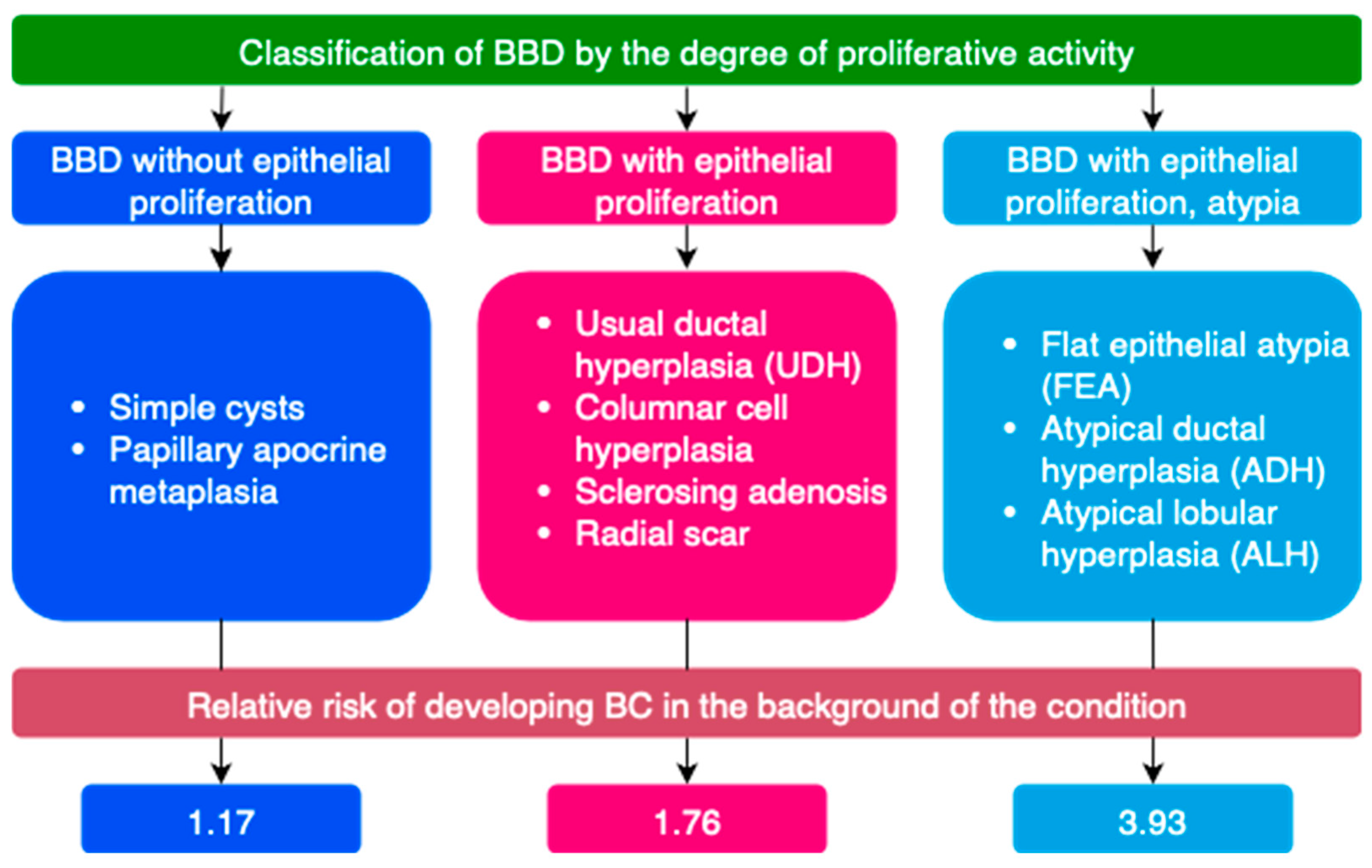 20]. In the presence of breast symptoms, breast cancer is detected only in 3–6% of cases. Consequently, there is a significant lack of evidence-based approaches for managing patients with benign breast conditions, since the main focus has been on optimizing diagnosis and treatment for breast cancer [