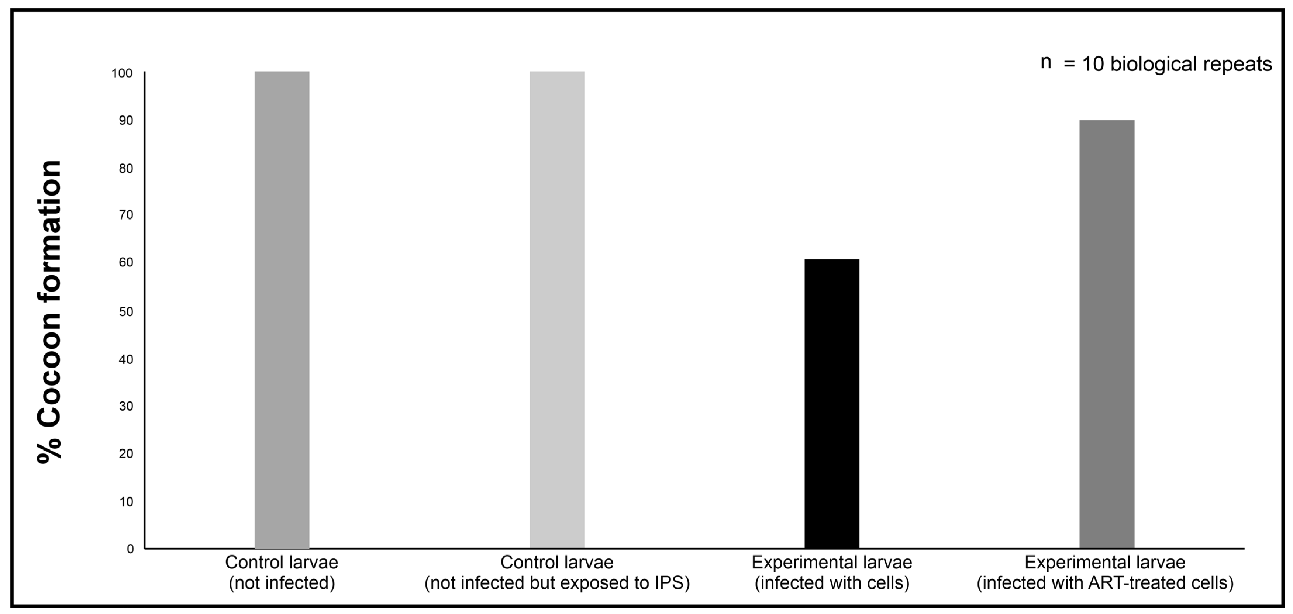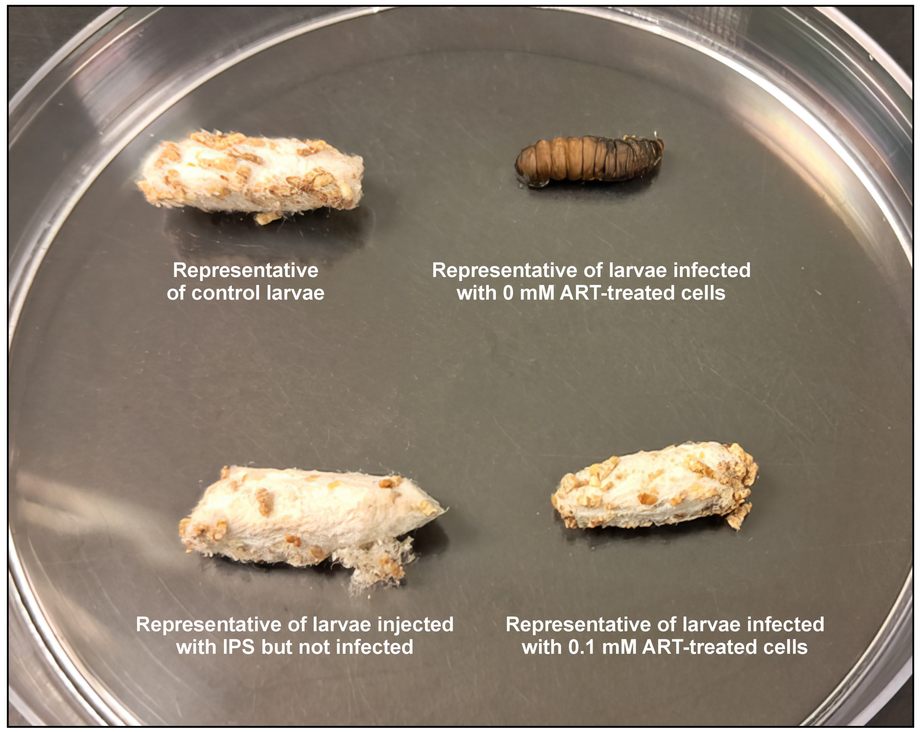 Section 4.3), using a Hamilton syringe with a 26-gauge needle. Control groups received 10 μL of sterile insect physiological saline (IPS; 50 mM NaCl, 5 mM KCl, 100 mM Tris-HCl, pH 6.9; Merck, Modderfontein, South Africa) but were not infected, or 10 μL suspension of cryptococcal cells treated with 0 mM of ART. Additionally, a control group of larvae not infected with cryptococcal cells or injected with IPS was included for comparison purposes. All the groups were made of 10 larvae. After handling, the larvae were incubated in Petri dishes. The survival rate was determined by assessing the number of larvae that could transition and form cocoons and expressed as a percentage. This implied that the larvae that could not form cocoons succumbed to the infection, while those that could, the ART treatment contributed towards infection resolution. The larvae were monitored daily post-infection until all the larvae of the control group, i.e., those that received 10 μL of sterile insect physiological saline, formed cocoons, and then the study was terminated. To calculate the ability of ART to rescue larvae from succumbing to infection, the following formula was used: