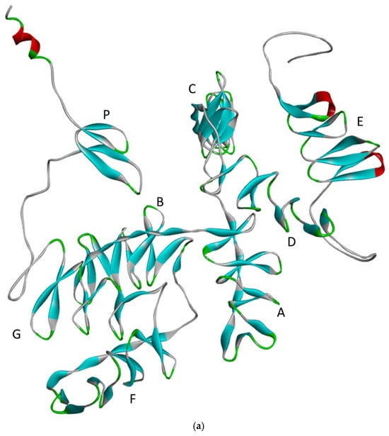 Among the above, the granulin gene (GRN), which encodes the PGRN, was a key genetic contributor to FTD. GRN on chromosome 17q21.31 (between 44,345,246 and 44,353,106 on the hg38 genome) contained 12 coding and one non-coding exon. PGRN protein, a 593-amino acid-long glycoprotein, consists of seven (P-G-F-B-A-C-D-E) and a half tandem repeats of granulin/epithelin module (GEM). Among the repeats, the P motif was the half domain, and the rest contained the full repeats. The individual PGRN domains are around 60 amino acids long (Figure 1) with 12 conserved cysteine residues for stabilizing the β-hairpins, global structure, and the overall protein structure [,,].