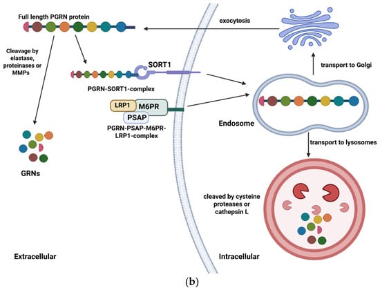 PGRN protein was processed by various intracellular and extracellular protease enzymes, in which the cleavages could occur in both extracellular (in the extracellular matrix) and intracellular areas, particularly in the lysosomes [,,,,,]. In the extracellular space, PGRN elastases, extracellular proteases (such as proteinase 3), and matrix metallopeptidases (MMPs) made their specific cleavages [,,,,,]. Inside the lysosomes, PGRN is processed by proteases into individual GRN peptides through the action of different enzymes, including cathepsin L or cysteine proteases [,]. Lysosomal PGRN trafficking was regulated by two different pathways. The first involved PGRN’s interaction with sortilin (SORT1) protein, while the second was mediated by prosaposin (PSAP) through mannose-6-phosphate receptors (M6PR) and lipoprotein receptor-related (LRP1) proteins. Full-length PGRN was also located in the compartments of secretory pathways and moved towards the extracellular spaces through exocytosis (Figure 1b). The processing of PGRN through lysosomes plays an essential role in balancing inflammatory pathways [,,]. The PGRN levels could be modified by different factors, including SORT1, PSAP, or receptor-interacting serine/threonine protein kinase 1 (RIPK1) proteins [].