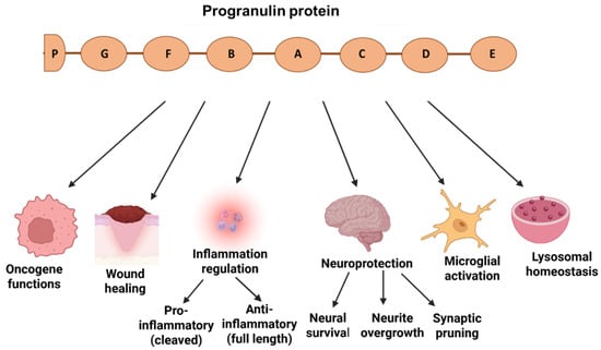 Several functions of PGRN in various pathways were identified, which involved a growth factor, promoting cell proliferation, survival, and migration. PGRN, as a mitogenesis inducer in epithelial cells, was implicated in tumor progression and transformation by inducing cyclin D1 expression and activating various mitogenesis and survival pathways (ERK or PI3K/Akt). As an oncogene, PGRN demonstrated its role in different cancers, including ovarian, breast, and hepatic carcinoma [,]. PGRN expressions were upregulated at wound sites and were verified to impact tissue recovery, matrix remodeling, and immune modulation during injury healing [,]. The full-length PGRN was revealed to contain anti-inflammatory effects by inhibiting pro-inflammatory cytokines. Furthermore, PGRN, as a neurotrophic factor, protected neurons against excessive microglial activation and neuroinflammation. However, after protease cleavages, the GRN peptides may promote pro-inflammatory responses and attract immune cells to injury sites []. In the brain, PGRN promoted neuroprotection, survival of nerve cells, neurite outgrowth, and synaptic pruning [,,,,,,]. PGRN was also verified to be essential for the homeostasis of lysosomal functions, such as protein degradation and lysosome biogenesis. PGRN regulated the lysosomal acidification and protease activities through cathepsin D or prosaposin-mediated sphingolipid hydrolysis [,]. Figure 2 summarizes the diverse functions of the PGRN protein.