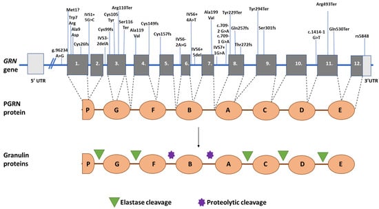 Interestingly, GRN mutations (e.g., Cys139Arg, Pro451Leu, or rs5848) were also reported in AD patients, which suggested that GRN could be a potential risk factor for AD. Specifically, the rs5848 AA allele was found to reduce the PGRN levels in the brain and plasma of AD patients [,]. However, further studies should be performed on the exact AD-related mechanisms of GRN mutation, as its reduced expression has been reported to be beneficial in cases of amyloid plaques. However, GRN may be involved in AD progression through amyloid-independent pathways []. Table 1 provides examples of GRN mutations with their effect of haploinsufficiency (reduced mRNA and protein levels). Figure 3 summarizes the location of GRN mutations and their location in the GRN gene and the PGRN protein.