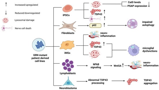 Taken together, patient-derived cell lines with various GRN mutations demonstrated different impairments, including TDP43 metabolism, inflammatory dysfunctions, lysosomal abnormalities, or reduced cell survival. The benefits of these models could be that they could offer a direct human-specific context for understanding GRN haploinsufficiency, providing insights that may be challenging to obtain from animal models [,,,,,,,,,,,,,,,,,,,,]. Cell models should be essential, since identifying the cellular impairments in the case of GRN haploinsufficiency could provide more opportunities in the case of drug development and testing. Drugs specifically designed for human physiology can be initially tested in these cell lines. Cell lines could be beneficial in understanding the disease heterogeneity by comparing the responses of the cells from patients with the same GRN mutations. This is particularly important in the development of personalized medicine, as understanding the differences in disease progression and response to treatment may be unique, and individualized therapeutic strategies may be necessary. Furthermore, patient-derived cell lines could provide a scalable and ethical platform for high-throughput screening of therapeutic compounds and candidates, before testing them in animal models or patients. The cell lines could also be beneficial for biomarker discovery in cases of granulin haploinsufficiency (e.g., WNT5A), which may aid in disease diagnosis and monitoring disease progression [,,,,,,,,,,,]. The disadvantage of cell lines is that they operate in an isolated environment, focusing solely on specific cellular effects. Furthermore, the gene-environmental interactions may be difficult to model in the cell lines [,,,,,,,,,,,].
