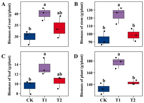 Biomass of S. suchowensis P1024 under different treatments in Pb-contaminated soil. Panels (A–D) represent root, stem, leaf, and total plant biomass, respectively. CK denotes the control treatment with organic fertilizer only, T1 indicates inoculation with T. guizhouense NJAU4742, and T2 indicates inoculation with B. velezensis SQR9. Each treatment included three biological replicates. Data are shown as boxplots with individual data points. Different lowercase letters above bars indicate significant differences among treatments at p < 0.05 according to one-way ANOVA followed by Tukey’s multiple comparison test.