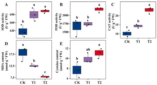 Physiological parameters measured in the leaves of S. suchowensis P1024 under different treatments in Pb-contaminated soil. Panels (A–E) represent superoxide dismutase (SOD), peroxidase (POD), catalase (CAT), malondialdehyde (MDA), and cysteine (Cys), respectively. CK denotes the control treatment with organic fertilizer only, T1 indicates inoculation with T. guizhouense NJAU4742, and T2 indicates inoculation with B. velezensis SQR9. Each treatment included three biological replicates. Data are shown as boxplots with individual data points. Different lowercase letters above bars indicate significant differences among treatments at p < 0.05 according to one-way ANOVA followed by Tukey’s multiple comparison test.