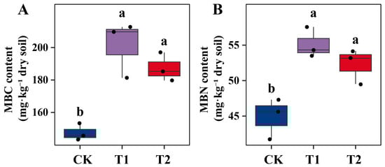 Soil microbial biomass under different treatments in Pb-contaminated soil. Panels (A) and (B) represent microbial biomass carbon (MBC) and microbial biomass nitrogen (MBN), respectively. CK denotes the control treatment with organic fertilizer only, T1 indicates inoculation with T. guizhouense NJAU4742, and T2 indicates inoculation with B. velezensis SQR9. Each treatment included three biological replicates. Data are shown as boxplots with individual data points. Different lowercase letters above bars indicate significant differences among treatments at p < 0.05 according to one-way ANOVA followed by Tukey’s multiple comparison test.