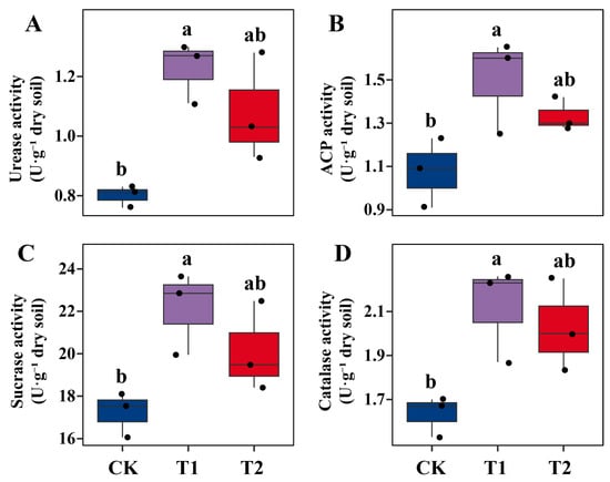 Soil enzyme activities under different treatments in Pb-contaminated soil. Panels (A–D) represent urease (UE), acid phosphatase (ACP), catalase (CAT), and sucrase (SC), respectively. CK denotes the control treatment with organic fertilizer only, T1 indicates inoculation with T. guizhouense NJAU4742, and T2 indicates inoculation with B. velezensis SQR9. Each treatment included three biological replicates. Data are shown as boxplots with individual data points. Different lowercase letters above bars indicate significant differences among treatments at p < 0.05 according to one-way ANOVA followed by Tukey’s multiple comparison test.