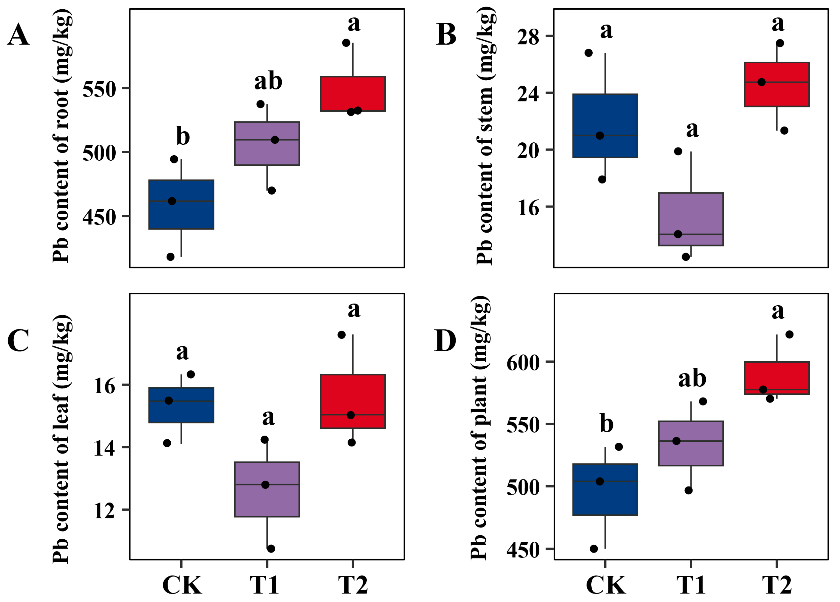 Pb content of S. suchowensis P1024 under different treatments in Pb-contaminated soil. Panels (A–D) represent Pb concentrations in roots, stems, leaves, and whole plants, respectively. CK denotes the control treatment with organic fertilizer only, T1 indicates inoculation with T. guizhouense NJAU4742, and T2 indicates inoculation with B. velezensis SQR9. Each treatment included three biological replicates. Data are shown as boxplots with individual data points. Different lowercase letters above bars indicate significant differences among treatments at p < 0.05 according to one-way ANOVA followed by Tukey’s multiple comparison test.