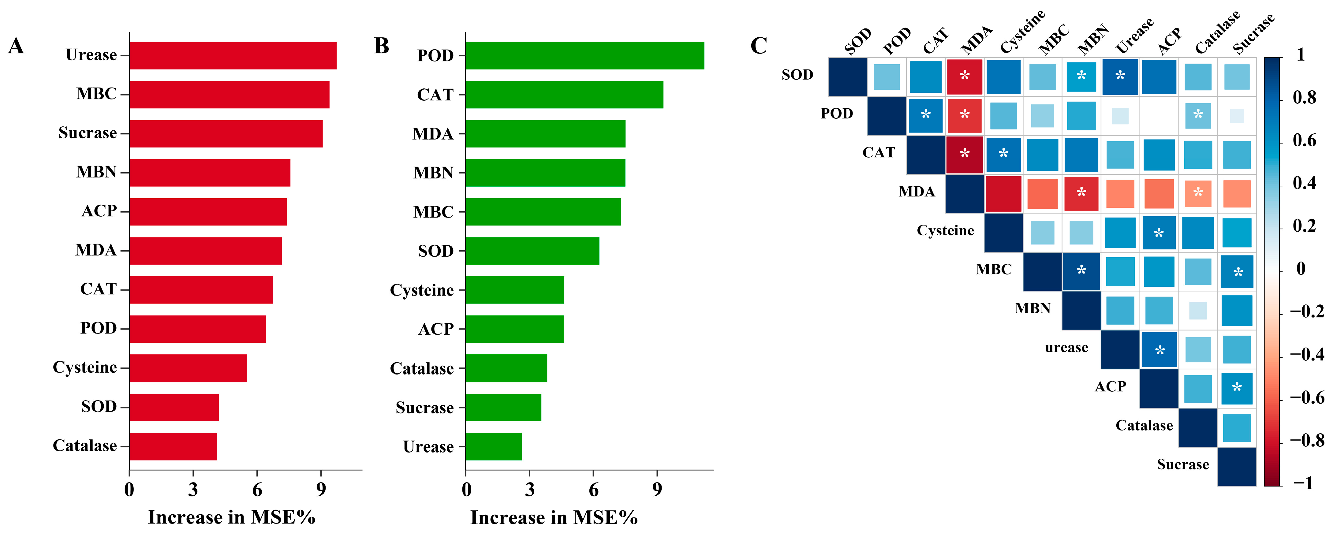 To disentangle the mechanisms by which microbial inoculation influenced willow performance under Pb stress, we conducted random forest analysis using total biomass and total Pb accumulation as explanatory variables. The model explained 86.45% of the total variance, indicating strong predictive reliability. The relative importance of soil and physiological indices was quantified, and their interactions further explored through Spearman correlation analysis (Figure 6). Random forest analysis showed that urease, MBC, and sucrase were the strongest predictors of total biomass, followed by MBN, ACP, and MDA (Figure 6A). This pattern reflects the dominant role of soil nutrient cycling and microbial biomass in sustaining plant growth, whereas antioxidant enzymes contributed to a lesser extent. The strong influence of urease and sucrase highlights that N and C cycling were central to biomass formation under Pb stress. This finding aligns closely with the ecological strategy of T. guizhouense NJAU4742, which is known to secrete extracellular enzymes, degrade complex organic matter, and release organic acids that mobilize nutrients [,]. By enhancing microbial biomass and accelerating nutrient turnover, NJAU4742 effectively drove the soil-mediated improvements in willow growth observed in this study. Thus, the statistical model supports the conclusion that Trichoderma primarily promotes growth by reshaping the nutrient environment of the rhizosphere. In contrast, Pb accumulation was most strongly predicted by antioxidant enzyme activities, particularly POD and CAT, followed by MDA, MBN, and MBC (Figure 6B). This indicates that tolerance to oxidative stress, rather than nutrient availability, was the decisive factor enabling greater Pb sequestration. This pattern is consistent with the functional traits of B. velezensis SQR9, which is well known for producing lipopeptides and signaling molecules that prime plant defense responses, leading to stronger activation of antioxidant enzymes and thiol metabolism []. Indeed, our physiological data showed that SQR9 markedly increased CAT activity, reduced MDA levels, and enhanced cysteine accumulation, all of which are critical for maintaining cellular integrity and enabling sustained Pb uptake. The random forest output therefore reinforces that Bacillus contributes more to Pb accumulation through direct physiological protection than to biomass promotion.