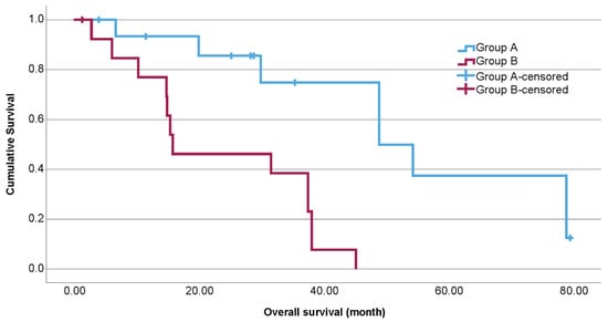 Kaplan–Meier estimates for overall survival (OS) according to therapeutic response to immune checkpoint blockade (group A = partial response (PR), stable disease (SD), and mixed response (MR); group B = progressive disease (PD)). The OS differed significantly (p < 0.001).