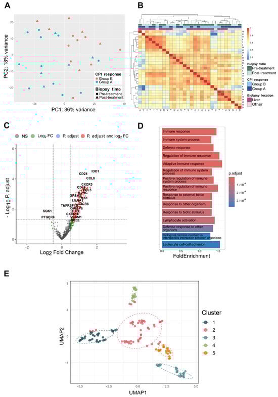 (A) Principal component analysis (PCA) plot of uveal melanoma samples based on the top 500 most highly expressed genes. The plot shows the first two principal components and the associated explained variance. The color corresponds to the ICB response group, and the shape corresponds to the biopsy time. (B) Heatmap of the pairwise Pearson correlations between samples. The color intensity reflects the strength of the correlation between samples; warmer colors (red) indicate greater similarity, and cooler colors (blue) indicate lower similarity. The annotation bars indicate the biopsy timepoint, ICB response group, and biopsy location. (C) Volcano plot of the differential gene expression analysis comparing group A (PR, SD, MR) to group B (PD). Genes are colored on the basis of the following cutoffs: log2-fold change (log2FC) > 0.5 and adjusted p value (P.adjust) < 0.05. Gray: nonsignificant genes (NS); green: genes with Log2FC > 0.5 only; blue points: genes with adjusted p value < 0.05 only; and red points: genes meeting both criteria (log2FC > 0.5 and adjusted p value < 0.05). (D) Bar plot showing the top 15 significantly overrepresented pathways. Pathways are ranked by adjusted p value (p.adjust) and colored accordingly, with warmer colors (red) indicating lower p.adjust values and cooler colors (blue) indicating higher p.adjust values. The X-axis displays the fold enrichment for each term. (E) UMAP (uniform manifold approximation and projection) visualization of similarities between the significantly enriched pathways. Each dot corresponds to a pathway, and the dot colors represent identified clusters.