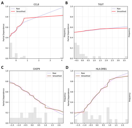 This figure shows two partial dependence plots (PDPs) illustrating the relationship between gene expression levels and the model’s predicted output. We used either a preselected subset of genes (top 5 genes, A,B) or all genes (C,D) and fed them into recursive feature selection for finer gene subselections. The best-performing pipeline with preselected genes selected CCL8 (A) and TIGIT (B) as biomarkers for use in the predictions and achieved ~78% accuracy on the testing dataset. Each plot shows both the raw (blue line) and smoothed (red line) partial dependence values, providing insight into how variations in gene expression affect the model’s predictions. Panel A, the plot for CCL8, shows that increasing expression levels are associated with an increasing predicted probability of stable disease/response to therapy, particularly at lower expression levels, where the curve shows a steeper slope. In Panel B, the TIGIT plot indicates that increasing TIGIT expression shows a modest linear effect on the predicted probability of stable disease/response to therapy. Below both plots, histograms display the distribution of gene expression levels in the dataset. While TIGIT was differentially expressed and was selected by the machine learning pipeline to be one of the genes used for prediction, it remains unclear whether its use as a biomarker for good clinical outcomes extends beyond our current dataset given the small sample size (n = 30), the moderate effects on the prediction outcome, and the fact that we failed to see the significance of TIGIT with an IHC stain, which we later performed. In the pipelines that used all genes, our best-performing one selected two genes for its prediction: CASP9 (C) and HLA-DRB1 (D). Panel C shows that increasing CASP9 expression is associated with a decreased predicted probability of stable disease/response to therapy. Panel D shows that increasing HLA-DRB1 expression is associated with an increased predicted probability of stable disease/response to therapy. The model achieved ~89% accuracy on the testing dataset. While CASP9 was not among the list of differentially expressed genes, HLA-DRB1 was, providing independent attestation to its possible value as a marker of therapy responders.