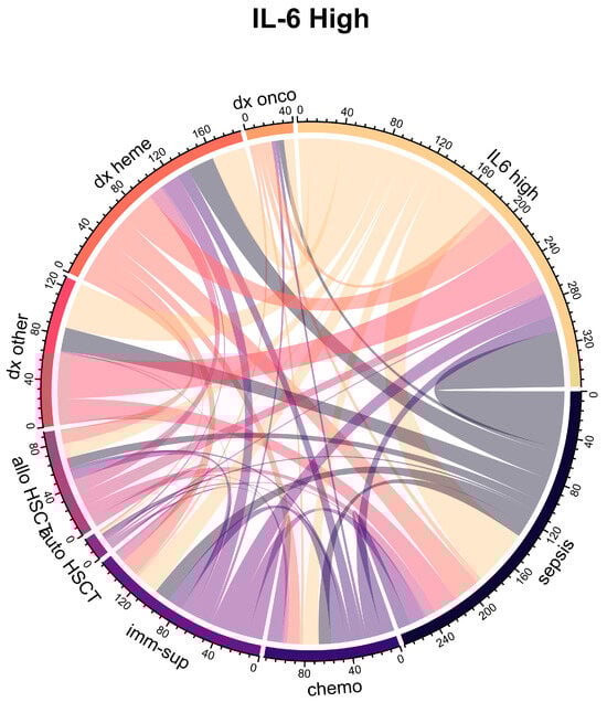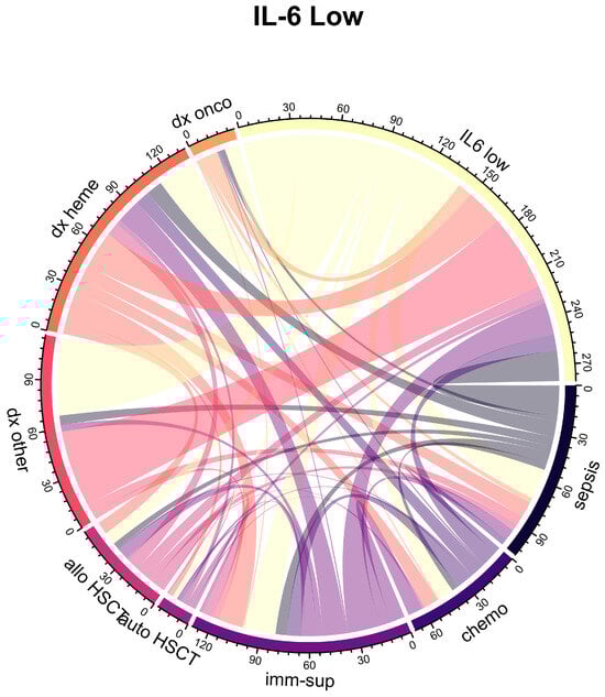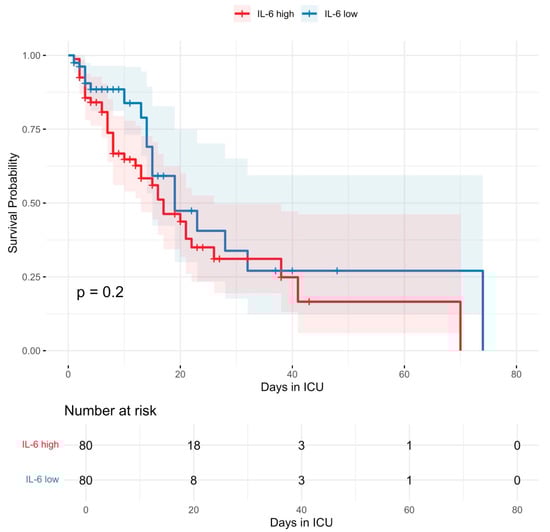 Patients were categorized based on plasma IL-6 levels measured on day 1 of ICU admission as either “IL-6 high” (≥200 pg/mL) or “IL-6 low” (<200 pg/mL). The cut-off approximates the cohort median and aligns with common literature values around 200 pg/mL [,,,].