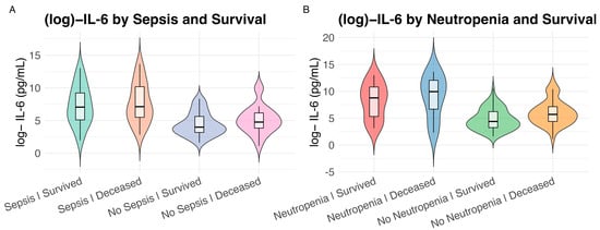 Pairwise co-occurrence of patient characteristics by plasma IL-6 level on day 1 (IL-6 high = IL-6 ≥ 200 pg/mL, IL-6 low = IL-6 < 200 pg/mL; log10 transformation was applied to reduce skewness and improve interpretability). Violin plots with boxplots represent (log10)IL-6 (pg/mL) levels by clinical subgroups. Pairwise group comparisons were analyzed using the Wilcoxon rank-sum test, significance annotated according to adjusted p value thresholds: (A) Sepsis and survival outcome. Wilcoxon rank-sum test: Sepsis|Survived vs. Sepsis|Deceased: p = 7.23 × 10−1; Sepsis|Survived vs. No Sepsis|Survived: p = 1.67 × 10−6; Sepsis|Survived vs. No Sepsis|Deceased: p = 5.14 × 10−3; Sepsis|Deceased vs. No Sepsis|Survived: p = 7.55 × 10−8; Sepsis|Deceased vs. No Sepsis|Deceased: p = 1.04 × 10−3; No Sepsis|Survived vs. No Sepsis|Deceased: p = 1.15 × 10−1. (B) Neutropenia and survival outcome. Wilcoxon rank-sum test: Neutropenia|Survived vs. Neutropenia|Deceased: p = 3.89 × 10−1; Neutropenia|Survived vs. No Neutropenia|Survived: p = 8.29 × 10−5; Neutropenia|Survived vs. No Neutropenia|Deceased: p = 1.79 × 10−2; Neutropenia|Deceased vs. No Neutropenia|Survived: p = 3.78 × 10−4; Neutropenia|Deceased vs. No Neutropenia|Deceased: p = 1.02 × 10−2; No Neutropenia|Survived vs. No Neutropenia|Deceased: p = 1.02 × 10−2.