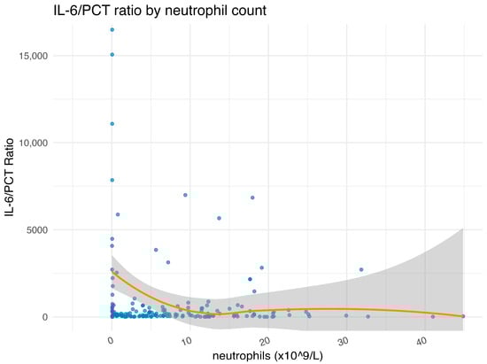 IL-6/PCT ratio versus neutrophil count (×109/L) per individual patient. Each point represents one patient measurement, the smooth orange line represents a locally estimated scatterplot smoothing (loess) fit, with a shaded area indicating the 95% confidence interval. Y-axis truncated at 16,000 for better visibility; no formal hypothesis test is displayed on this plot.