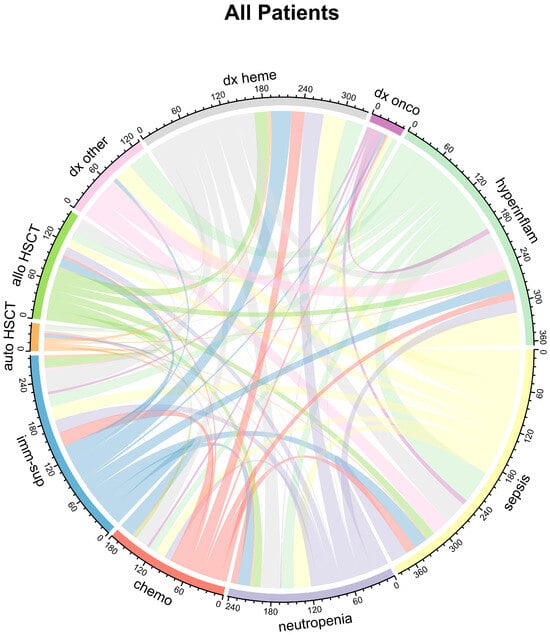 To identify distinct clinical subgroups within the cohort, LCA [] was performed using ten dichotomized indicators that have been implicated as predictive features: sepsis, cancer, chemotherapy, mechanical ventilation, renal replacement therapy, hyperinflammation, elevated IL-6, immunosuppression, neutropenia, and fever on day 1. Models specifying one to six latent classes were evaluated, with selection guided by fit indices including the Akaike information criterion (AIC) [], sample size-adjusted Bayesian information criterion (aBIC) [,], likelihood ratio/deviance statistic (G2), p values from likelihood ratio tests comparing k versus k–1 classes, and entropy [] to assess classification certainty. The final number of classes was determined based on a balance of statistical fit, parsimony, and clinical interpretability. Posterior probabilities of class membership were calculated for each patient, and median assignment probabilities were used to evaluate classification quality. Sensitivity analyses, performed by iteratively removing individual indicators, assessed the influence of each variable on the model. Model stability was further examined using 500 bootstrap resamples, from which median, mean, SD, and 95% CI of item–response probabilities were derived. Heatmaps were generated to visualize class-specific item–response probabilities and to illustrate the robustness of assignments across bootstrap samples.
