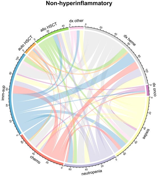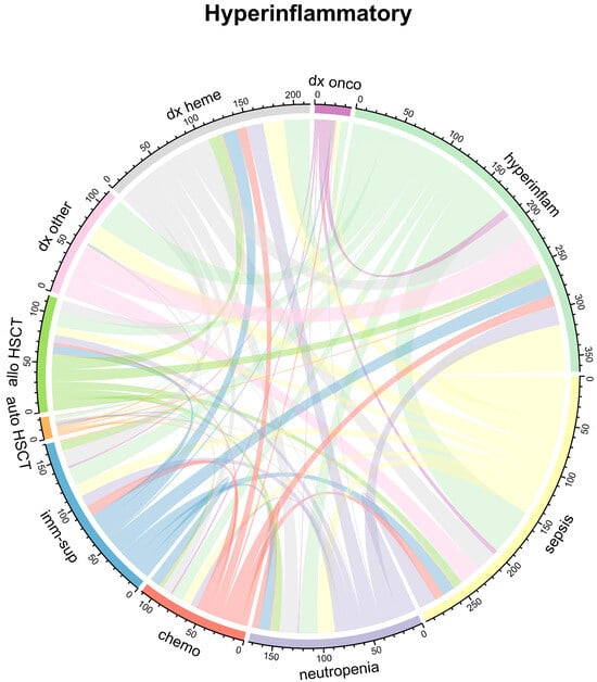 Moving beyond single biomarkers, we sought to identify clinically meaningful inflammatory subgroups. We defined two broad phenotypes: a hyperinflammatory phenotype (IL-6 ≥ 100 pg/mL, predicted mortality probability > 40%) characterized by sepsis, prior allogeneic HSCT, mechanical ventilation, vasopressor requirement, and elevated inflammatory markers other than IL-6 (CRP, PCT, lactate, and cortisol), and a non-hyperinflammatory phenotype with lower disease burden. Outcomes differed markedly: mortality was 58% in the hyperinflammatory phenotype compared to 22% in the non-hyperinflammatory phenotype.